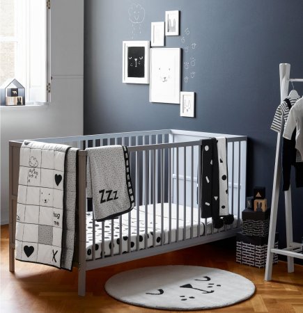 Для создания такой детской сочетайте простую черно-белую палитру с оригинальными рисунками и модными материалами. Стены можно украсить монохромным обоями или просто покрасить в однотонные цвета. Более «строгий» вид комнате придадут обои в полоску. Для такого интерьера можно купить деревянную мебель с четкими линиями, дополненную постельным бельем и аксессуарами с геометрическим рисунком.