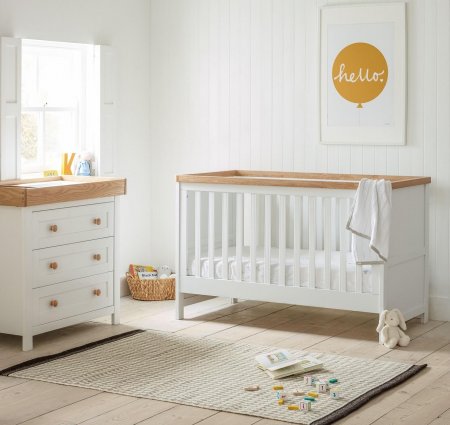 Если вы хотите детскую в сочетании классического и современного стилей, то можно выбрать классический белый фон в сочетании с серыми оттенками. Подберите подходящую кроватку, кресло для вас, аксессуары на стену.