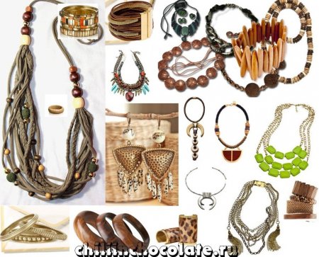В сафари-look допустимо включать бижутерию в африканском стиле, предпочтительно из натуральных камней, дерева, шнуров и т.п. Можно использовать и массивные украшения из металла.