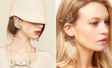 Каффы – украшение, отличающееся от традиционных серёжек тем, что закрывает собой ушную раковину целиком и может переходить даже на волосы или шею. Кафф, хоть и является довольно крупным аксессуаром, смотрится утонченно и отнюдь не громоздко. Кафф может быть единственным украшением. И несмотря на обилие деталей, ваше ухо не будет напоминать новогоднюю ёлку. Ещё одно достоинство – возможность надеть украшение на непроколотое ухо, так что носить его могут все – даже те, у кого болит голова из-за клипс, или те, кто по каким-то причинам не может проколоть уши.