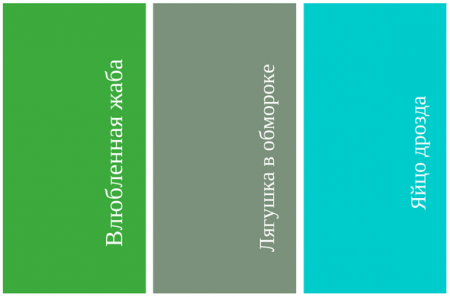 Влюбленная жаба. Довольно модный на сегодня приглушенно-зеленый цвет. Правда, не очень понятно, как было вычислено, что именно такого цвета влюбленная жаба, но почему бы не оставить в истории места загадке. Наряды в этом оттенке смотрятся довольно стильно.