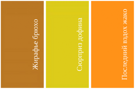 Цвет сюрприза дофина (он же — цвет детской неожиданности). Эта горчично-желтая гамма вошла в моду после того, как одна из светских дам прилюдно продемонстрировала испачканные пеленки наследного принца. Придворные оценили картину и быстро обновили гардероб, пополнив его странными желтоватыми нарядами.