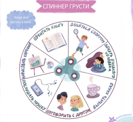 Спиннер грусти. Это упражнение из книги Виктории Шиманской «Где живут эмоции?». Оно учит с помощью игрушки – спиннера – переключать внимание с грусти на радость.