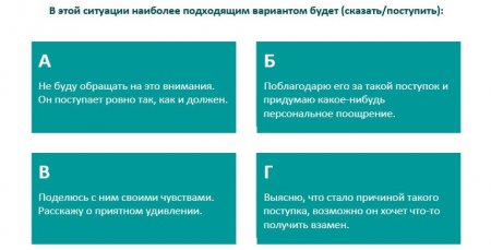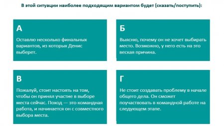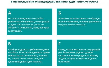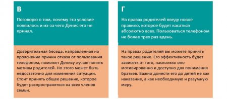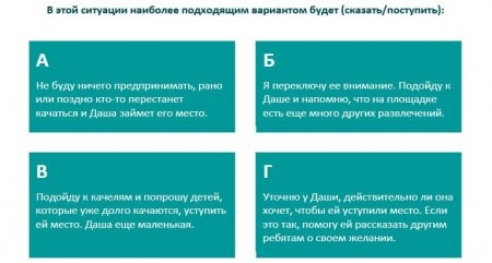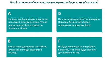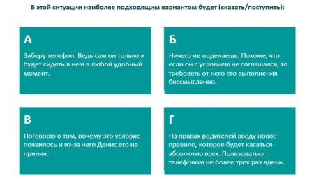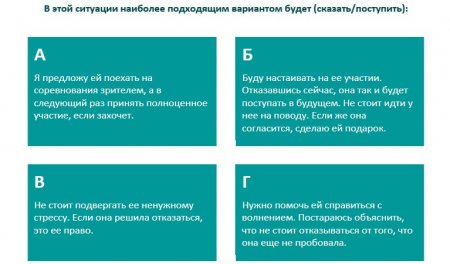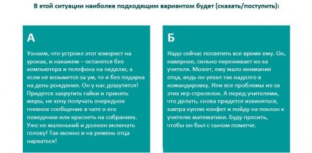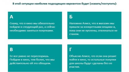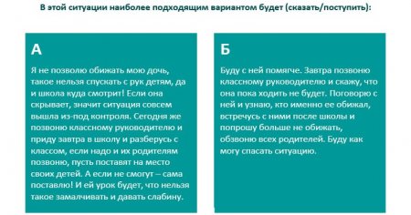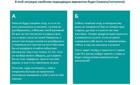 | Оценить, насколько верны и адекватны установки родителей, понимание ими сути проблемы и ее возможных последствий и собственно поведение в этой ситуации. | Предложить оптимальное решение для данной ситуации, выбрав один из четырех вариантов ответа, на основе ответа на вопросы: 1. Как следует относиться к данной ситуации? (установка родителя) 2. На основе какого подхода нужно разрешать эту ситуацию? (ценности, принципы, общая стратегия поведения и реагирования родителя) 3. Что конкретно нужно сделать и предпринять? Что сказать и как поступить родителю? (тактика воспитания, конкретные методы, приемы воспитания). |