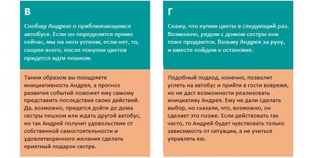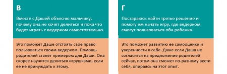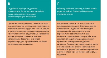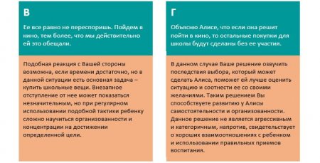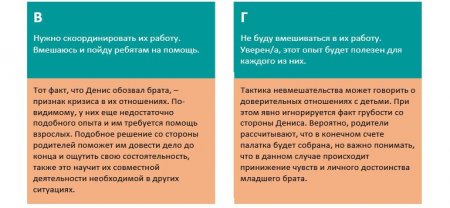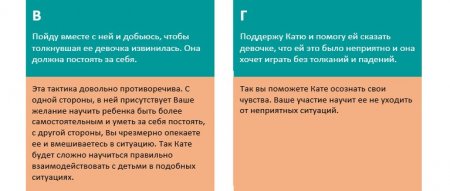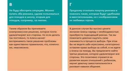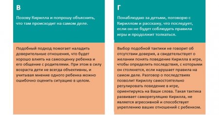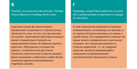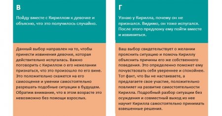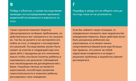 Подобные реакции родители могут считать допустимыми, но они обязательно требуют обсуждения и корректировки. Во время консультации старайтесь расширять представление об альтернативных стратегиях, предлагая оценить и сравнить их с точки зрения последствий, которые содержаться в комментариях психолога к каждому выбору в самой игре (см. приложение).