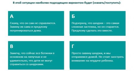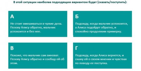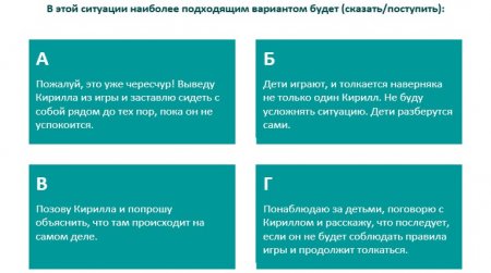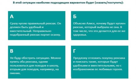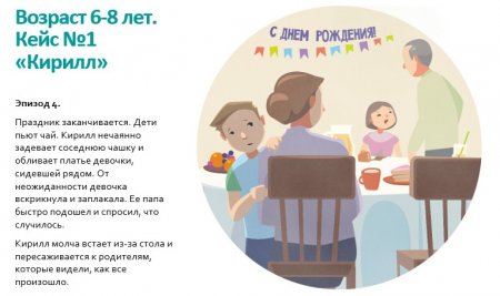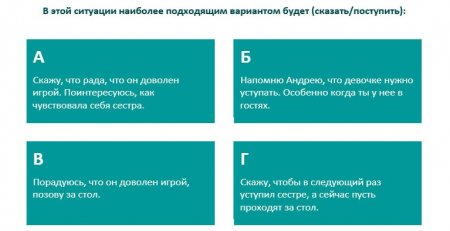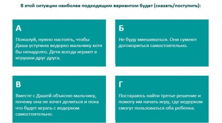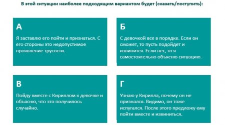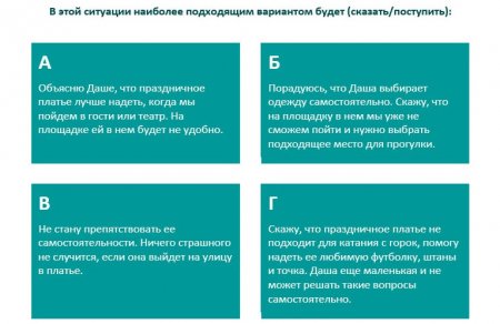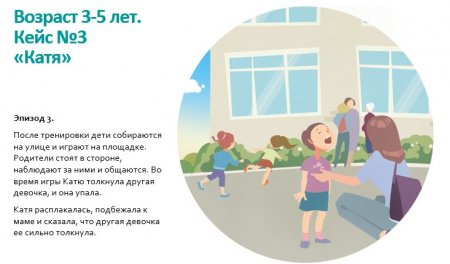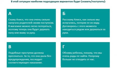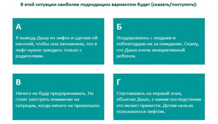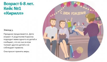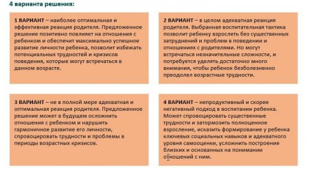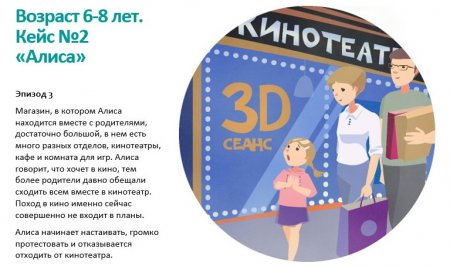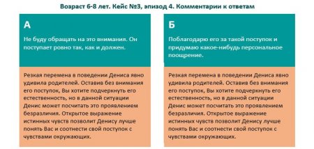 Родителям предлагается развернутая проблемная ситуация с описанием взаимодействия ребенка и родителя, поведения ребенка. Им нужно решить этот кейс, поэтапно отвечая на вопросы с разными вариантами ответов.