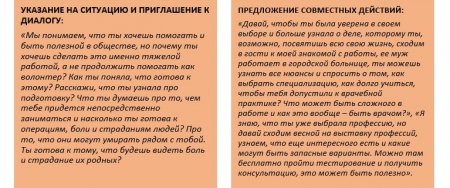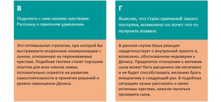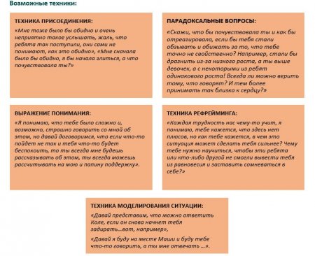 Психологическая работа должна быть направлена на прояснение мотивов выбора. Задача психолога – строить беседу таким образом, чтобы родители видели качественные различия между каждой из приведенных реакций. Для этого используются открытые (развивающие) вопросы, направленные на раскрытие актуального эмоционального состояния родителя: