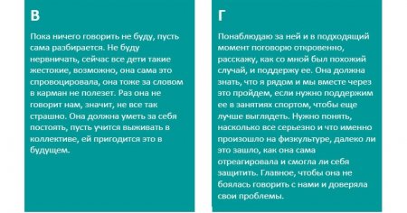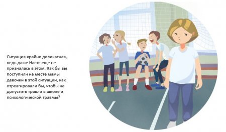 | Мама 10-летней Насти стала замечать, что в последнее время девочка приходит из школы грустная и раздраженная, ей тяжело вставать с утра, она долго собирается и стала придумывать отговорки, ссылаясь на якобы плохое самочувствие и усталость, чтобы не идти на занятия. На вопросы о том, что случилось, девочка отвечала, что ничего особенного, что была ссора с подругами, но все наладилось, что просто устала и хочет побыть дома. Маму немного удивил тот факт, что за последние две недели ей особенно не хотелось идти в школу по четвергам. Когда они всей семьей поехали в магазин за продуктами, мама решила порадовать дочку и купить ей новое платье, но девочка наотрез отказалась, сославшись на то, что ей платье не нужно и лучше купить толстовку. Она выбрала вещь темного цвета, что не особо понравилось маме, но спорить она не стала. | На следующий день, ожидая Настю возле школы, мама разговорилась с мамой одной из ее подруг и совершенно случайно узнала, что над Настей на физкультуре смеялись одноклассники и ребята из параллельного класса, когда она не смогла выполнить упражнение. Кто-то из ребят грубо и неприятно пошутил над ней, и это стало гулять по школе. Но Настя об этом ничего не сказала дома. Мама сильно испугалась, что над девочкой станут издеваться ровесники. Теперь все встало на свои места, ведь именно в четверг по расписанию у Насти физкультура. У Насти нет проблем с лишним весом, ее нельзя назвать толстой. Но из-за широкой кости (гиперстенический тип сложения) и того, что она более развитая по сравнению с другими девочками, она выглядела более крепкой и крупной. Нетрудно догадаться, что она серьезно переживает и начинает стыдиться своего тела. |