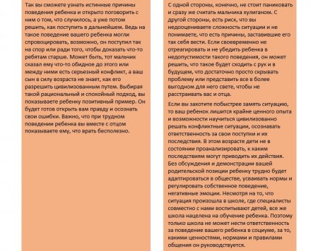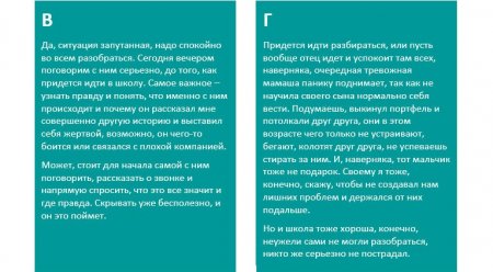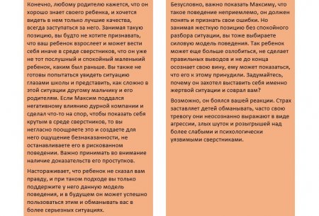 | Мама заметила у 11-летнего Максима царапины на лице и надорванный рукав недавно купленной рубашки. На вопрос, что именно случилось, он погрустнел и признался, что его задирал и побил старшеклассник, но он не дал себя в обиду и ответил, как мог. Что ничего страшного нет, и они разобрались по-мужски, а волноваться из-за возможного повторения ситуации вовсе не стоит. Максим слезно просил, чтобы мама с папой не вмешивались, иначе над ним будут смеяться в школе, будто он «маменькин сыночек». Мама облегченно вздохнула и собиралась вечером с гордостью рассказать папе о том, что сын взрослеет и растет «настоящим мужиком», что может постоять за себя и что вложенные в воспитание силы себя оправдывают. Это особенно было важно для папы, он в свое время настоял на том, чтобы Максим начал ходить в разные силовые секции и не рос «тряпкой». | Но ее опередил неприятный звонок от классного руководителя с приглашением прийти в школу на встречу с другим родителем, так как, оказывается, Максим задирает мальчика из младшего класса, подрался с ним и выбросил из окна его портфель на глазах ребят. Мальчик пытался его остановить и оттолкнуть от окна. Более того, это уже не первый случай. После того как Максим первым толкал его на перемене, о чем есть запись на школьных камерах, с ребятами была проведена беседа, и Максим обещал его не трогать, но ситуация снова повторилась. Также он был замечен с ребятами из старших классов за школой, и от него пахло сигаретами. Мама того мальчика настроена враждебно, классный руководитель хочет решить все мирно и не усугублять конфликт в школе. |