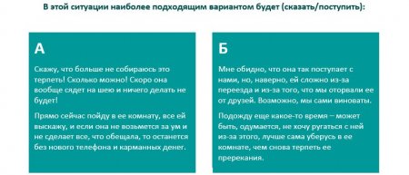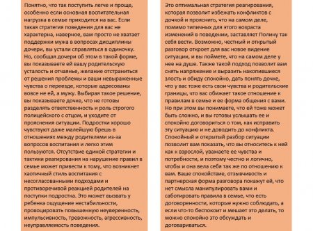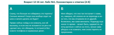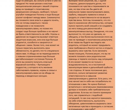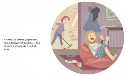 | Семья Гавриловых недавно переехала в другой город из-за работы отца. 13-летней Полине было непросто расставаться со школьными друзьями, но ей пришлось принять эту ситуацию и смириться, хотя она до сих пор немного обижена на родителей и при каждом удобном случае не забывает напомнить им про это. Чтобы смягчить ситуацию, родители недавно подарили ей новый дорогой телефон и многое стали разрешать. Полине в целом удалось встроиться в новый школьный коллектив и найти общий язык с учителями. Но в последнее время отношения между ней и мамой стали напряженными. | Учеба у Полины стала хромать, посыпались двойки и замечания учителей, она все больше уходит с головой в общение с подругами по телефону вместо того, чтобы исправлять оценки, вообще перестала помогать по дому и периодически игнорирует просьбы родителей. После очередного напоминания мамы, что она должна была прибраться в своей комнате еще 3 дня назад, Полина грубо ответила: «Ну что ты пристала с этой комнатой? Я никому ничего не должна, мне сейчас некогда, потом уберусь. Никто же не умер, от того, что она не убрана. Меня лично вообще все устраивает». |