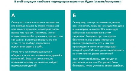 Родителям предлагается поэтапно решить кейс, состоящий из 3-4 различных ситуаций, выбирая один из 4 предложенных вариантов ответа. Любой выбор родителя будет сопровождаться комментарием психолога с анализом эффективности данного решения и его влияния на воспитание и развитие ребенка и на взаимоотношения с ним. В конце дается общая оценка каждой ситуации и рекомендации для родителей.