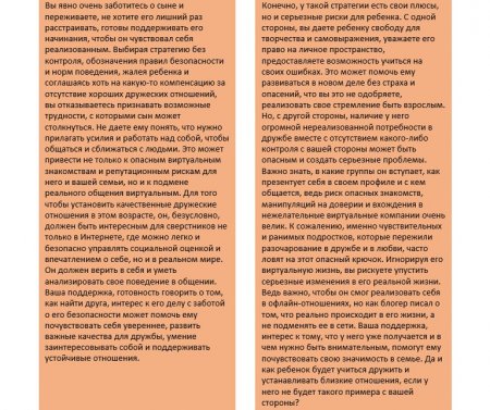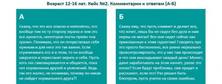 | У Никиты до 13 лет были сложности с друзьями, он не мог завести устойчивые дружеские отношения, в основном все ограничивалось формальным общением в классе и в секциях или такой «дружбой», когда ребятам была нужна от него только какая-то помощь. Так, однажды ему показалось, что ему удалось сдружиться с одним мальчиком, но тот часто смеялся над ним перед всем классом, а сближался только тогда, когда нужна была помощь в учебе. Никита очень переживал из-за этого и все чаще стал общаться в Интернете, вступать в разные группы, паблики, подписывался на блоги, даже прошел несколько обучающих вебинаров на тему блогерства. В 14 лет он решил раскручивать свой Youtube-канал и профиль в социальных сетях. Стал готовить материалы, монтировать видео, активно рассказывать о себе и всех событиях в своей жизни, брать хайповые и скандальные сюжеты из Интернета. Чтобы привлечь аудиторию, он начал выкладывать фото с дорогими вещами из дома, постить смешные видео в tik-tok, смешно озвучивать первых лиц страны с нецензурными шуточками и мемами. | Постепенно количество подписчиков стало расти, на него начали подписываться, смотреть и оставлять комментарии не только его знакомые, но и совершенно незнакомые люди, в том числе и взрослые. Комментарии были как позитивного, так и некорректного содержания. После того как количество подписчиков перевалило за 1 тыс., стали поступать предложения о рекламе и раскрутке его паблика. Ребенок сказал, что это абсолютно нормально и ничего страшного нет, потому что так все делают. Папа Никиты работает в силовых структурах, для семьи крайне важна репутация в обществе и Интернет-пространстве, а также информационная безопасность. Родители начали беспокоиться, что ребенок слишком много рассказывает о себе, делится спорным и провокационным контентом, постоянно отмечает геолокацию из дома, дачи и школы. Шутит по поводу резонансных тем и провокационных проблем в школе. После поста с подсказками, как обмануть учителей, чтобы получить хорошую оценку, у родителей вполне естественно возникло опасение, что его активность и нежелательный контент навлекут проблемы на него и семью в целом. Ведь в борьбе за хайп и подписчиков он будет выкладывать много такого, за что им придется краснеть, или еще хуже – попадется на крючок мошенников. |