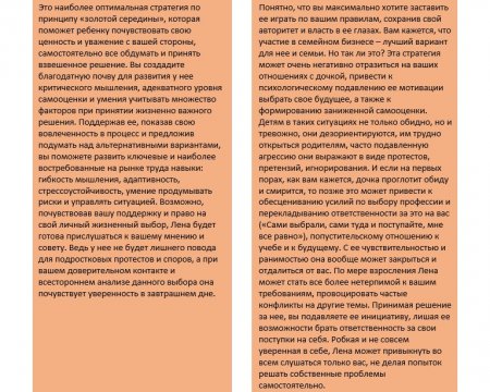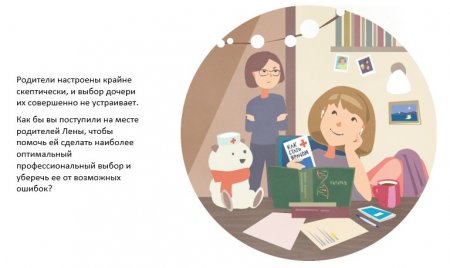 | Лене недавно исполнилось 15 лет. С детства она ни в чем особо не нуждалась, у родителей свой бизнес - сеть магазинов. Она немного застенчивая, скромная, добрая, ранимая и открытая девочка, как и все подростки, часто переживает из-за того, что о ней подумают другие. Особенно волнительно для нее выступать на публике: боится ошибиться и не справиться с волнением, очень переживает из-за неудач и теряется в стрессовых ситуациях. У нее есть близкие школьные подруги, она неплохо учится и в целом не доставляет родителям проблем. С детства она обожает всем помогать и в качестве волонтера участвует в разных благотворительных проектах. В последнее время у нее появилась мечта, и как ей окажется, она определилась со своей будущей профессией – хочет стать врачом. Неважно при этом, в какой именно специализации, главное – помогать людям. | Она подробно все узнала про это, уверяет семью, что с биологией и русским языком проблем на экзамене не будет, а математику она подтянет. Насмотревшись мотивирующих фильмов и сериалов о доблестных подвигах врачей, о том, что нужно идти к своей мечте и делать то, что хочется, она заявила родителям о своем решении. Но родители желание дочери воспринимают как издержки детской позиции, «девичьи мечты» и сомневаются, что она выдержит такую психологическую нагрузку и ответственность, ведь в детстве боялась походов к врачам и вида крови. К тому же они хотели бы, чтобы она выбрала профессию в мире финансов и менеджмента. Только так она всегда сможет встроиться в семейный бизнес и быть при деле. Им кажется, что она не отдает себе отчет в том, как долго ей придется учиться и стажироваться, через что нужно будет пройти в ходе этого обучения и что эта профессия не для ее чувствительного характера, что она не справиться со стрессом. |