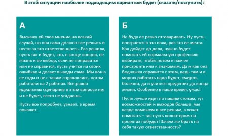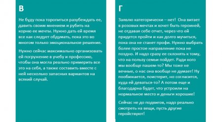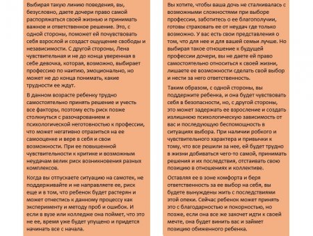 Как в случае с Леной, это вовсе не значит, что есть только 2 стороны медали – разрешать или не разрешать. Важно дать ей «побыть в этом выборе» и почувствовать поддержку родителей, чтобы она взвесила и изучила свой выбор на рациональном уровне, осмыслила его и рассмотрела несколько запасных вариантов, где она может реализовать свои потребности. Она может очень быстро сама передумать и понять, что это слишком долгий процесс учебы, огромная личная ответственность за жизнь и здоровье людей, болезни и страдания, обучение в моргах и т.д.
