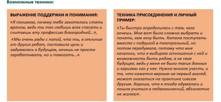 - Поддержать его в стремлениях и мечтах, узнать глубинные мотивы и потребности, ценности, которые важны для него в будущем деле. Возможно, он не до конца понимает и учитывает огромный спектр профессий, где это тоже можно реализовать не хуже чем в той профессии, которую он пока выбрал лишь на эмоциональном уровне.
