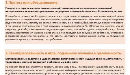 Во время игры, если родители проходят ее при вас, необходимо обращать внимание на невербальные проявления и возможные устные комментарии. Это является дополнительным материалом для обсуждения во время беседы по результатам прохождения игры. Смена позы, ерзанье на стуле, вздохи, смех, различные комментарии и другие проявления свидетельствует об эмоциональном отношении к содержанию игры. Обращайте внимание, в какие моменты родитель их демонстрирует. Сам он может их не замечать и даже не помнить, но прояснение и акцент на этих проявлениях может стать хорошим поводом для формирования связи между ситуацией, реакцией со стороны родителя и пониманием причин такого реагирования.