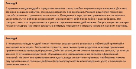 Обсуждение ситуаций и выборов внутри кейс-игры становится первичным пространством для взаимодействия. В ходе консультирования такая стратегия является более безопасной по сравнению с обсуждением реальных событий. Родители остаются внутри этого смоделированного пространства из-за комфортного ощущения – «обсуждаем не меня и не мои ситуации взаимодействия с ребенком». Тем не менее, за счет ярких примеров и неоднозначности предложенных вариантов поведения беседа будет продуктивной.