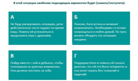Перед началом игры необходимо подчеркнуть, что в ней нет верных или неверных ответов, каждый выбор может быть эффективен или неэффективен. Это необходимо для вовлечения родителя в игровую ситуацию и снижения его внутренней тревоги. Такой подход уменьшает вероятность поиска родителями непременно «правильных» ответов и способствует выбору ответов, наиболее отражающих их реальные действия и эмоции в подобных ситуациях.