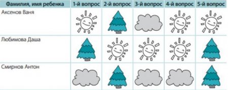 Для наглядности полученных данных составляется таблица в «цвете», где по горизонтали проставляются номера вопросов, а по вертикали прописываются фамилии учащихся и на пересечении проставляется рисунок ребенка.