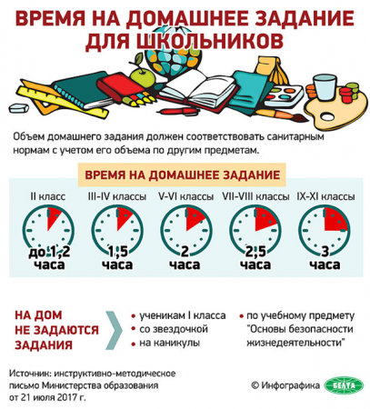 Время на выполнение домашних заданий должно быть строго определено. Первоклашкам достаточно выделить на это 20-30 минут с пятиминутными перерывами между заданиями, чтобы они могли немного отдохнуть и переключиться с одного предмета на другой. У старших школьников это время увеличивается до двух-трех часов – в зависимости от количества предметов и индивидуальных особенностей.