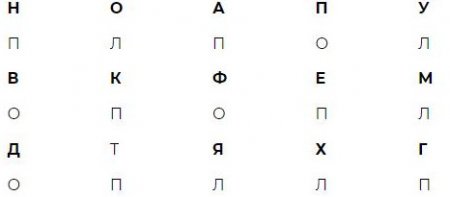 «Алфавит». Лист с буквами распечатайте и вручите ребенку. Надо произнести верхние буквы и одновременно выполнить действие, которое обозначено буквами нижними: «П» — поднять правую руку, «Л» — левую, «О» — обе.