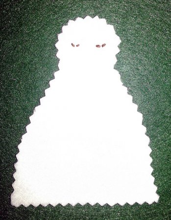 Складываем первый лист пополам, и с длинного края ножницами ведем вверх линию, очерчивающую «тело» ангела. Примерно за 2 сантиметра до верха листа сильно закругляем линию. Так мы очерчиваем линию шеи. Затем округляем срез, чтобы получилось полушарие – будущая голова. «Юбку» можно сделать любого «фасона» – закруглить или оставить острые углы, по желанию.