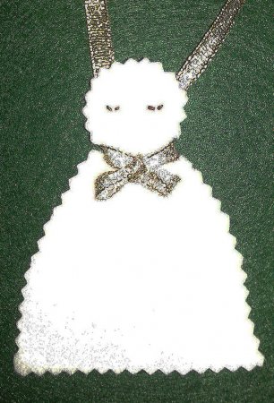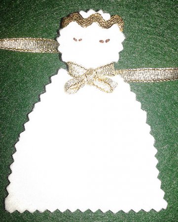 Отрезаем 20–25 сантиметров от тесьмы для банта. Складываем ленту пополам и посередине завязываем бант, чтобы концы тесьмы остались свободными. Прикладываем его к шее ангела бантом вниз. Тогда длинные концы пойдут вверх по шее ангела.