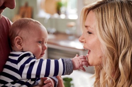 К концу 8 месяца зрение и внимание младенца развиваются настолько, что на расстоянии до 40 см он видит хлебную крошку и пытается схватить ее. Хорошо отличает своих от чужих, подражает интонации взрослых, начинает понимать слова и жесты.