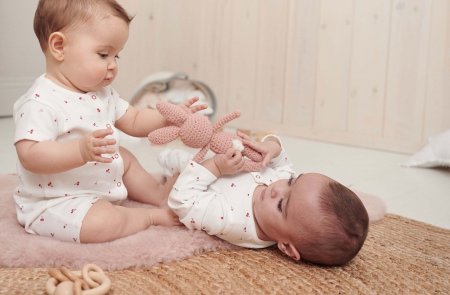 Малыш становится активней с каждым днем. Он ползёт, садится, рассматривает заинтересовавшие его вещи и снова ползёт. Любит рассматривать картинки и фотографии. Делает первые попытки собрать пирамидку или вложить один стакан в другой. Всё тянет в рот, любит рушить собранные из кубиков башни, мять листы бумаги. Учится пить из чашки.